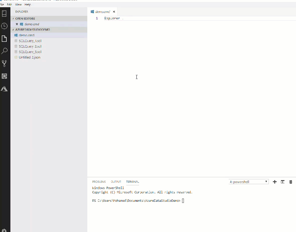 Internal terminals, an amazing feature that Azure Data Studio has. It makes the life of DB Admins easier, you don’t need to open many apps and windows, just all in one tool is needed. We all know that we can open a folder or a workspace in Explorer (Explorer panel of Azure Data Studio, not Windows Explorer), you have some file scripts and you want to run it. There is command provided for this task to run the active file or just the selected text in the active terminal. In Figure 5, you can see how it works. This command doesn’t have a keyboard shortcut by default (you can add one by editing the keyboard shortcuts 😉). To make it work, open the command palette and type: